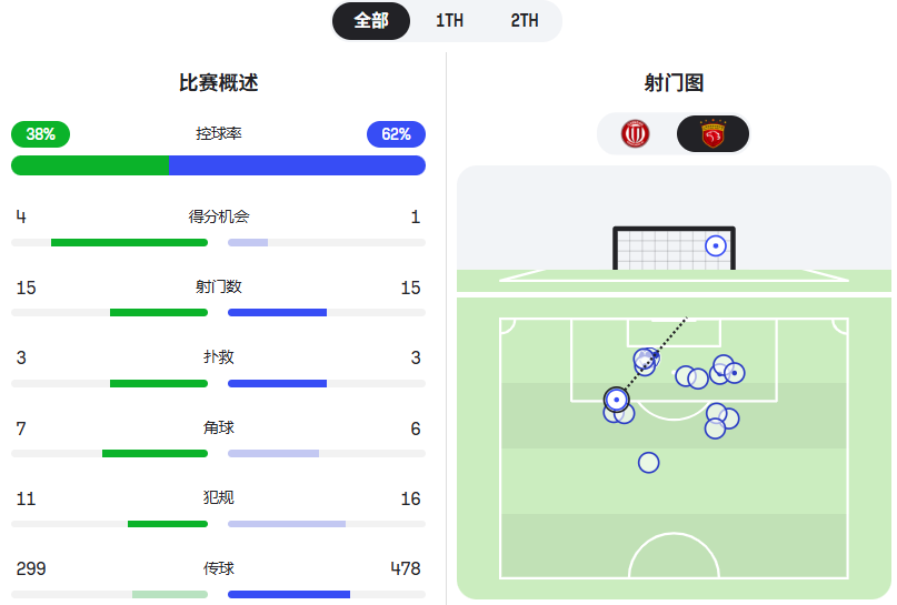 从统计数据看,两队都是15次射门,不过成都蓉城绝佳得分机会是4次,上海海港只有1次,进攻质量上的差距还是很明显的。